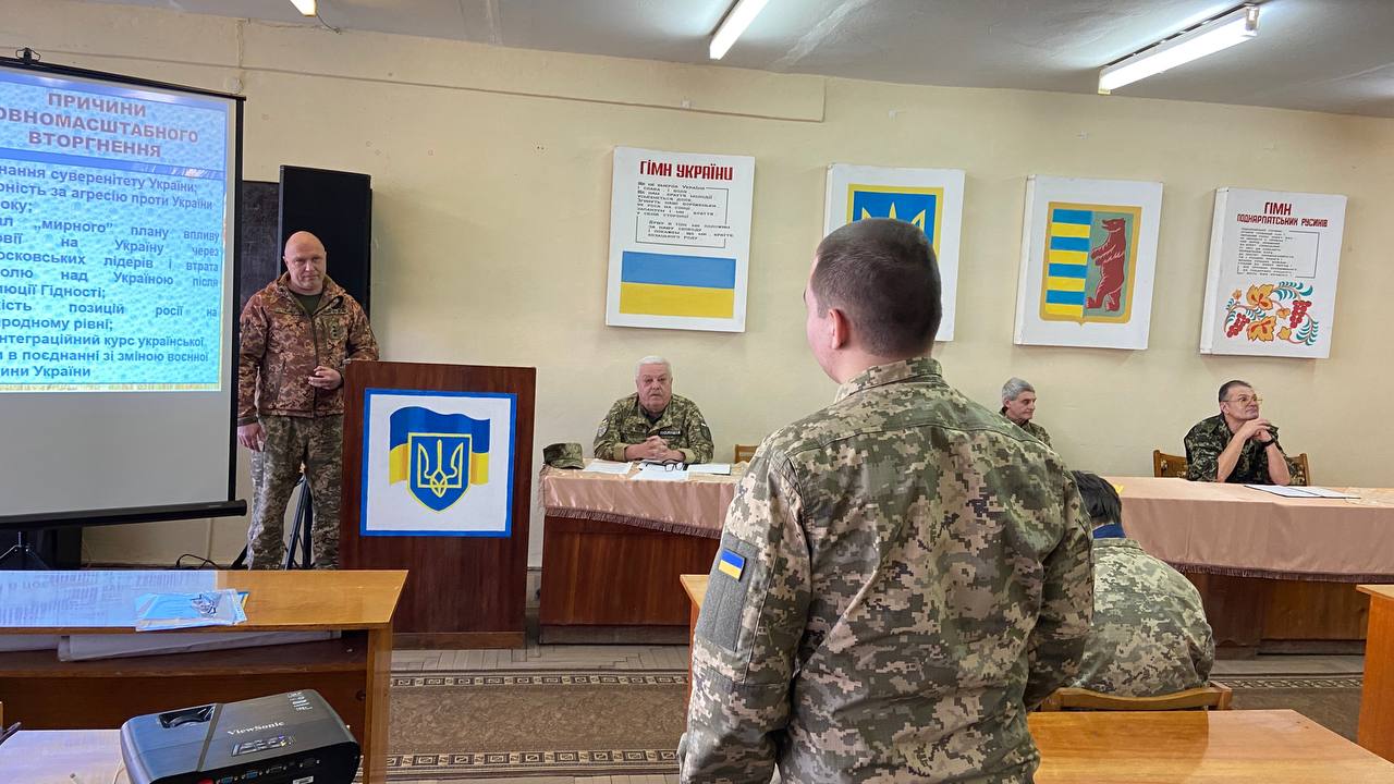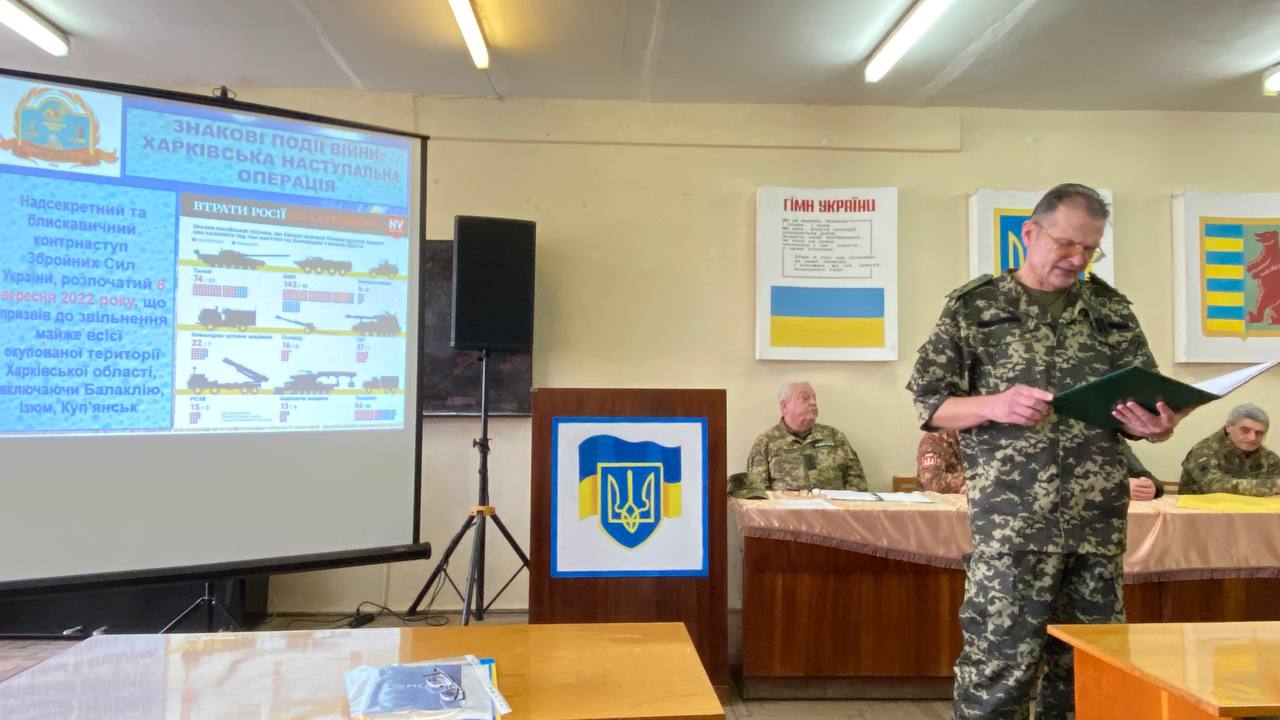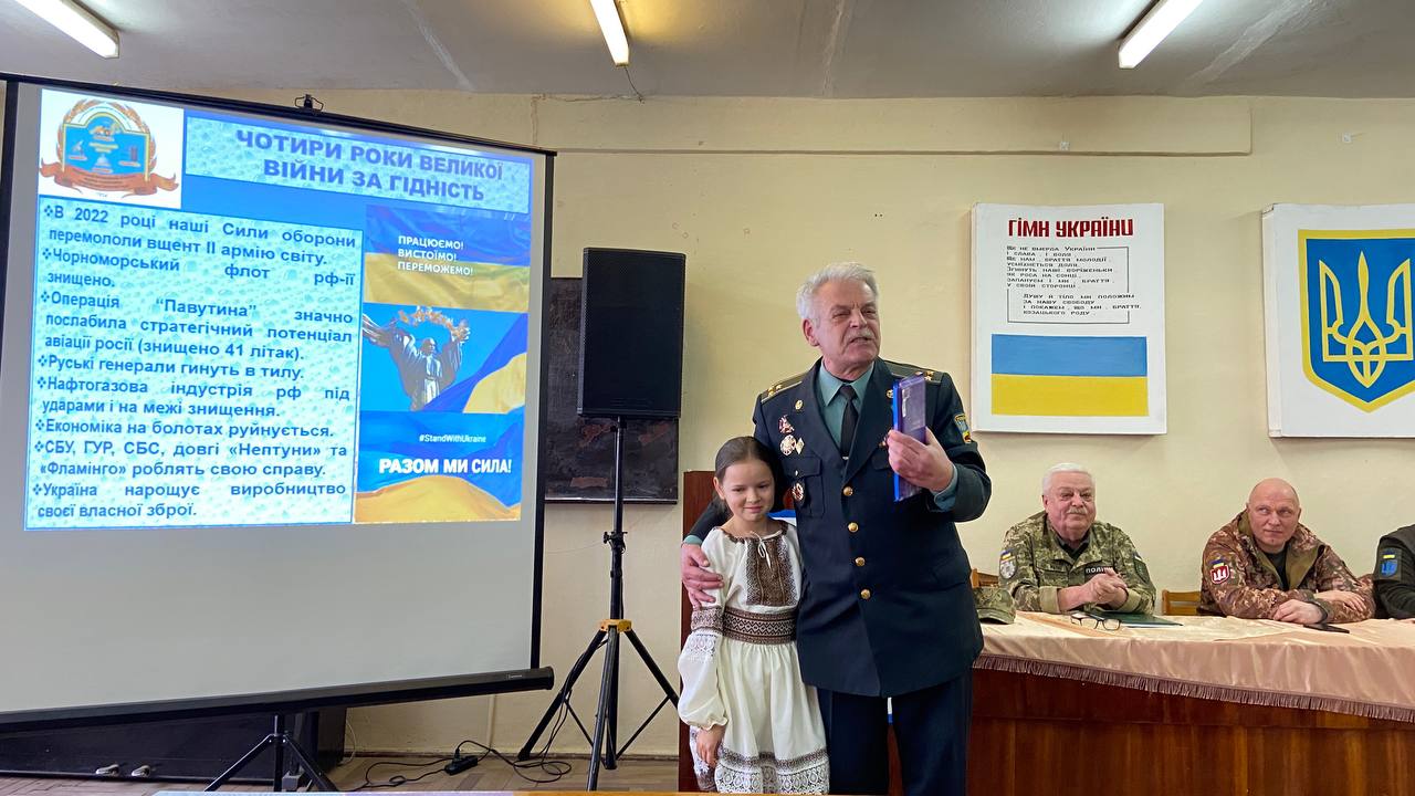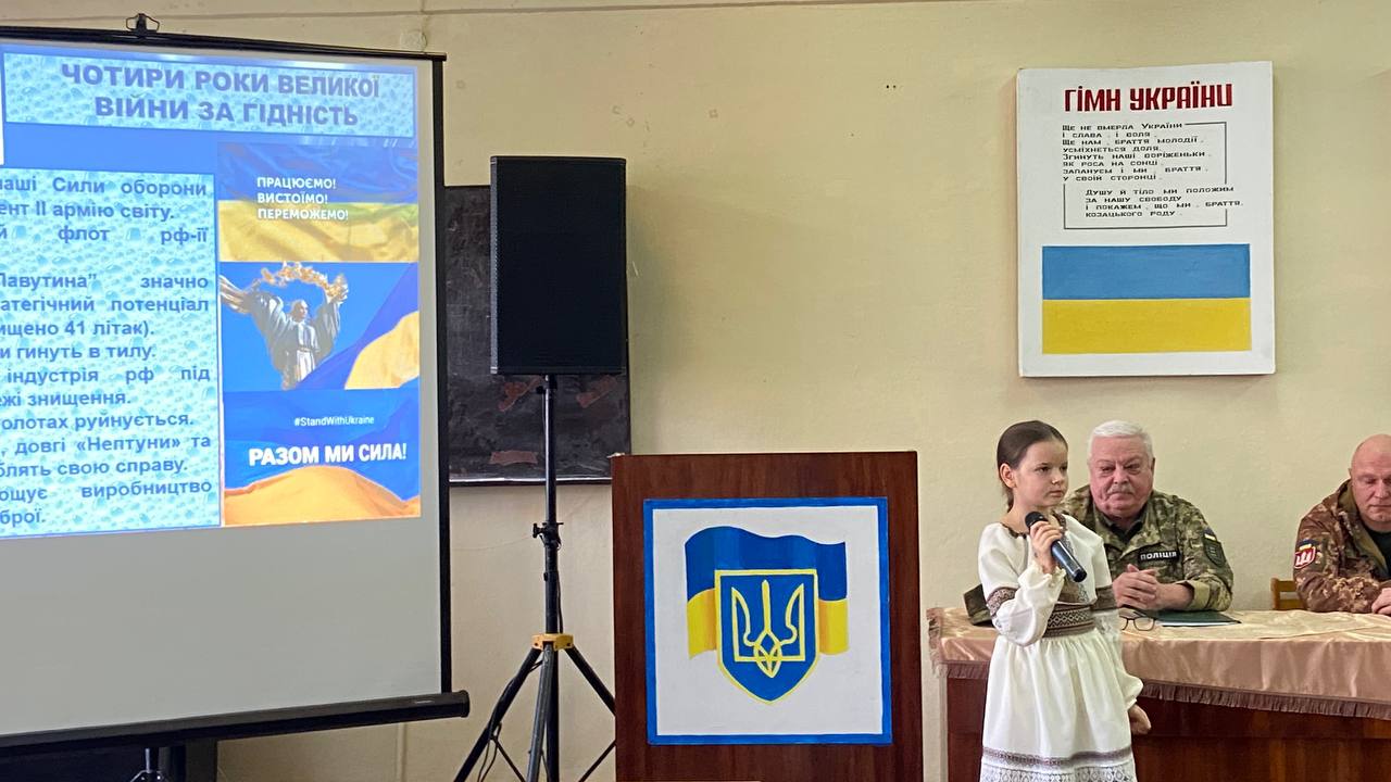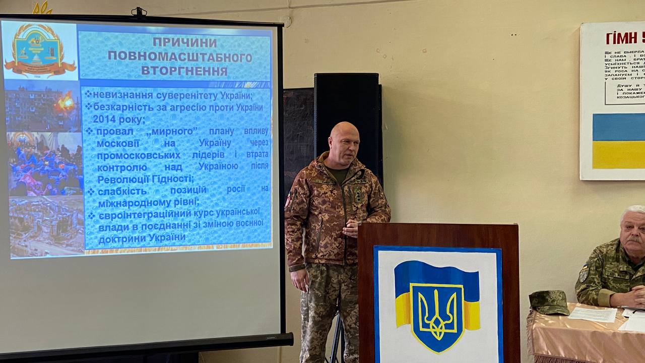 Юрій Єгоров розповів присутнім про причини, передумови та псевдопривід ворожого вторгнення. Педагог відзначив, за всі чотири роки великої війни, ворожі війська захватили близько одного відсотка нашої території. Просування рашистів на фронті – це сотні метрів, іноді лічені кілометри. А втрати в живій силі, військовій техніці та озброєнні перевищують загальний людський і технічний потенціал цілої Європи.