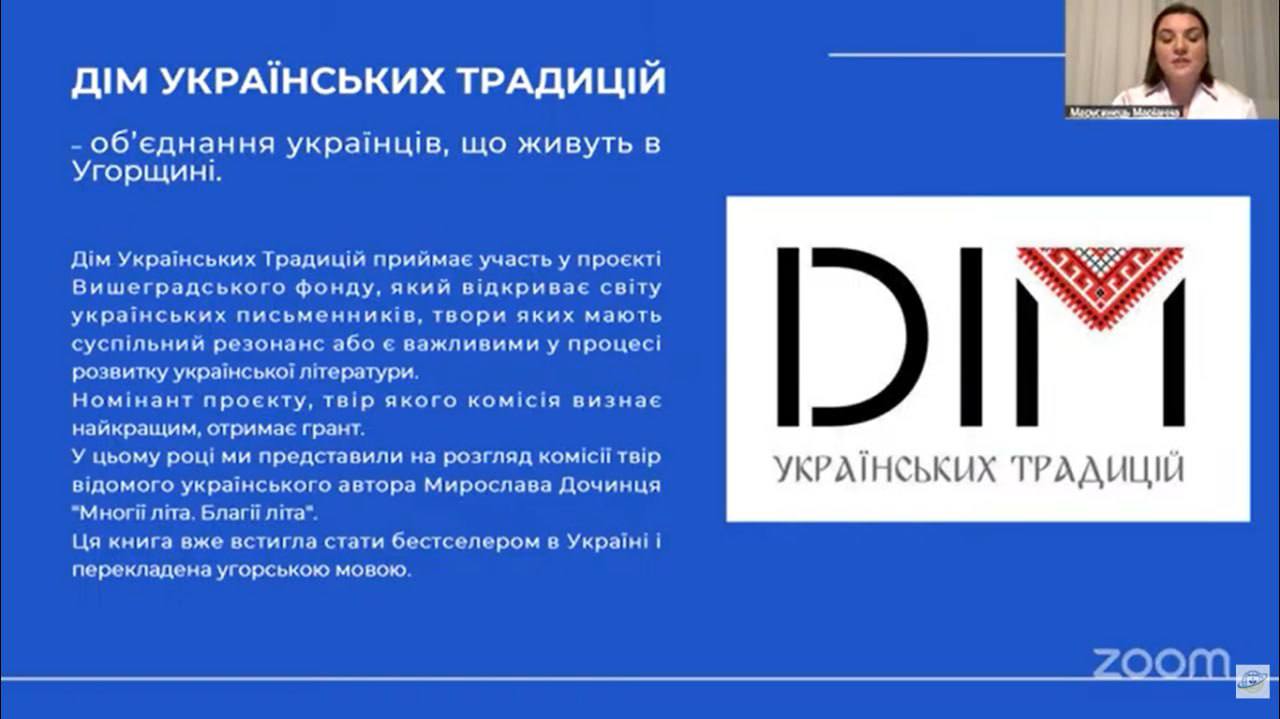 Вона відмітила, що Дім Українських Традицій приймає участь у проєкті Вишеградського фонду, який відкриває світу українських письменників, твори яких мають суспільний резонанс або є важливими у процесі розвитку української літератури. Номінант проєкту, твір якого комісія визнає найкращим, отримає грант.