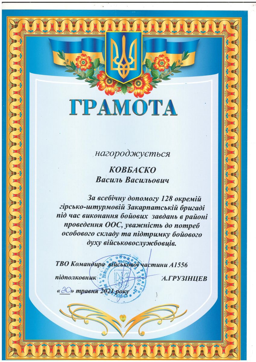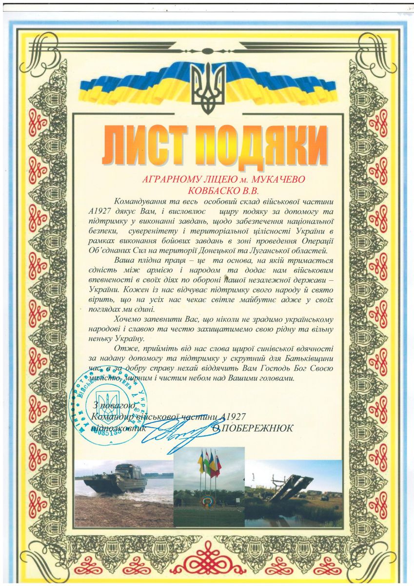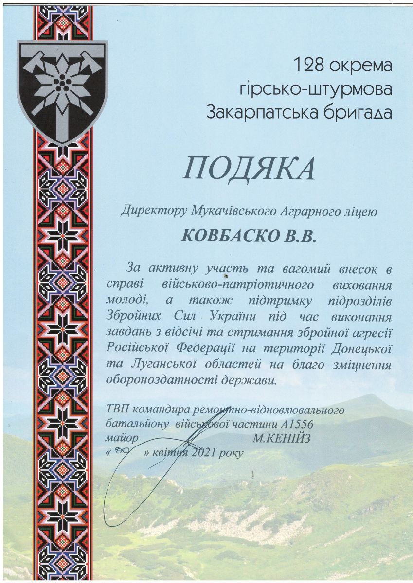 Протягом декількох десятків років триває тісна взаємодія та співпраця педагогічного колективу нашого ліцею та особового складу військових частин, розташованих на теренах Закарпаття. Прикладів такої взаємодії існує багато. Адже наш колектив високо цінує професіоналізм, мужність, героїзм, честь та відвагу воїнів 128 гірсько-штурмової бригади, яка зі зброєю в руках боронять нашу державу і забезпечує спокій українців. Нещодавно на ім'я директора ДПТНЗ "Мукачівський професійний аграрний ліцей імені Михайла Данканича" Василя Васильовича Ковбаско надійшли грамоти та подяки від командира бригади та військових частин зі словами вдячності за уважність до потреб та підтримку бойового духу військовослужбовців