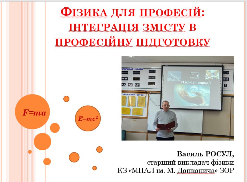 Актуальність міжпредметної інтеграції розкрив викладач фізики Василь Росул у виступі «Фізика для професій: інтеграція змісту в професійну підготовку», підкресливши значення прикладного спрямування навчального матеріалу та його безпосередній зв’язок із майбутньою професійною діяльністю здобувачів освіти. У межах виступу було представлено приклади практичних завдань, адаптованих до освітнього процесу в групах електромонтерів, трактористів та слюсарів з ремонту колісних транспортних засобів, що сприяє усвідомленню ролі фізичних законів у реальних виробничих ситуаціях.