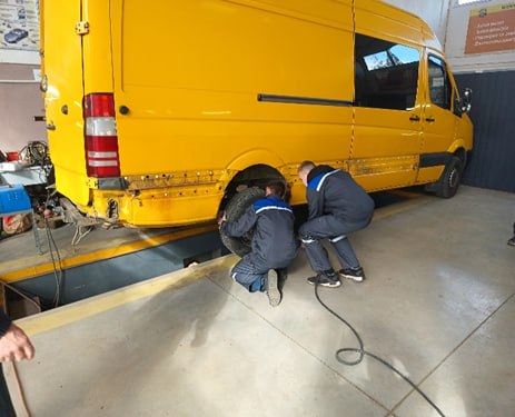 Для наочного вивчення було використано автомобіль Mercedes-Benz Sprinter, на якому майстер продемонстрував основні елементи гальмівної системи та роботу дискових гальм у реальних умовах.