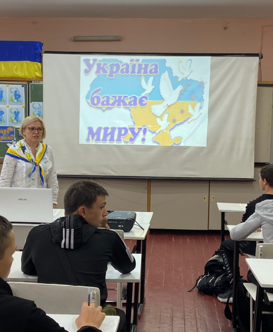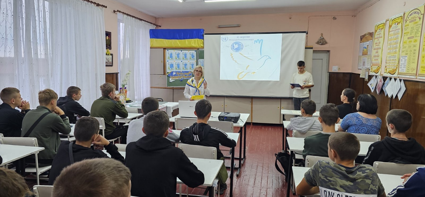 Марія Дудаш, класний керівник групи №22 за професією тракторист-машиніст сільськогосподарського виробництва, слюсар з ремонту сільськогосподарських машин та устаткування, водій автотранспортних засобів (категорія С), підготувала для здобувачів освіти інформаційний блок про історію Міжнародного дня миру, його емблеми та символи та про організації, які працюють над зміцненням миру та розв'язанням конфліктів у світі. Юнаки і юнки дізналися багато цікавого і корисного про ініціативи та проєкти, спрямовані на збереження миру.
