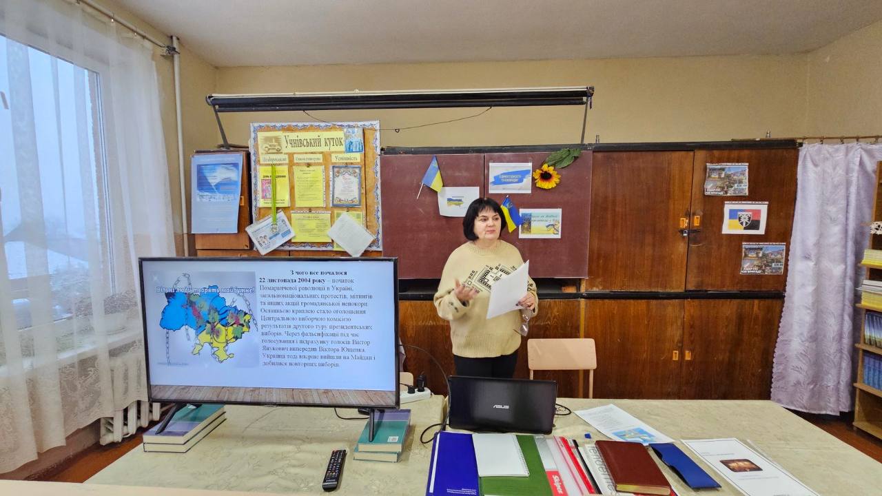 Під час виховного заходу учні обговорили основні історичні події, пов’язані з Помаранчевою революцією та Революцією Гідності, а також взяли участь у дискусії про важливість захисту демократичних цінностей.