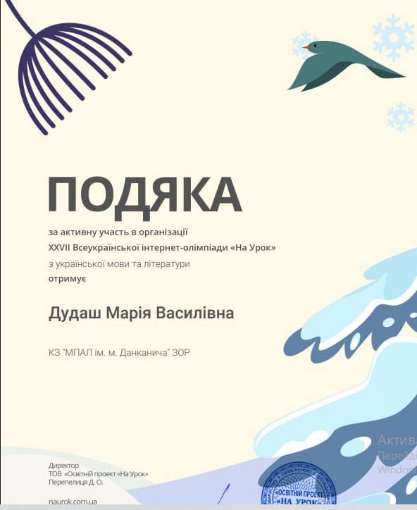 За результатами участі в онлайн-олімпіаді «На Урок» (Зима 2026) здобувачі освіти ліцею отримали 48 дипломів І ступеня, 8 – ІІ ступеня та 7 – ІІІ ступеня. Викладачка Марія Василівна Дудаш отримала Подяку за активну участь в організації XXVII Всеукраїнської онлайн-олімпіади «На Урок» з української мови та літератури, а також Свідоцтво про підготовку 63 переможців.